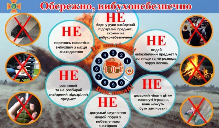 - НЕ торкайтеся: Будь-який підозрілий предмет (снаряд, міна, граната, покинута валіза, коробка) може здетонувати від дотику, удару, тертя чи навіть зміни температури.